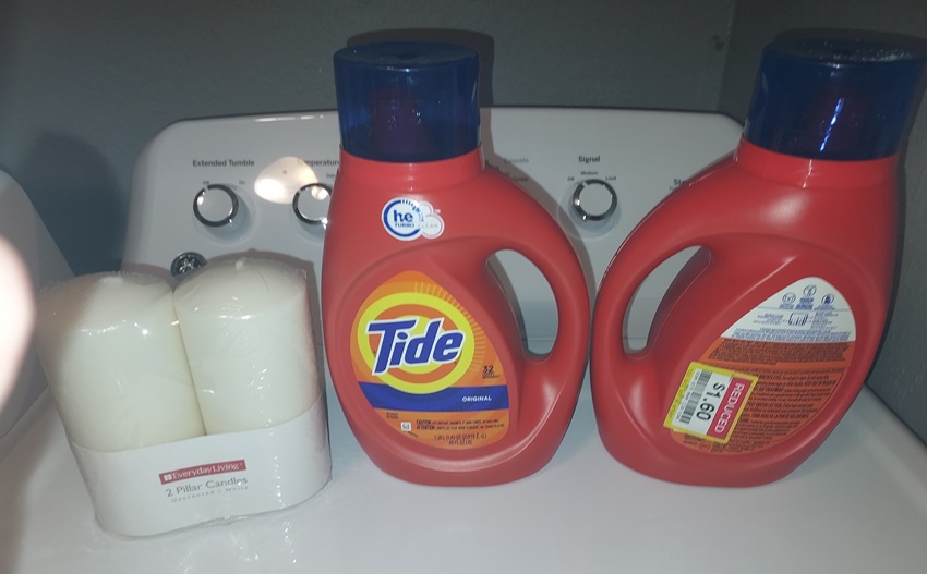 I hit the clearance bins on Tuesday at Kroger and found a pair of pillar candles for $1.50(lots of storms here in the Spring so good to have for power outages)and 2 jugs of He type Tide marked down to $1.60 each.